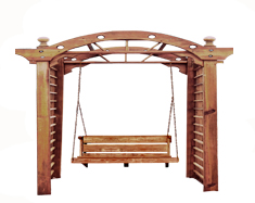 Современные деревянные качели, изготовленные из экологически чистого материала, соединяют в себе качели и диван, размер сидения которого можно варьировать от 0,5 до 2 метров. Крыша, возведённая над качелями, надёжно защищает отдыхающих от солнца или дождя. А боковые стенки увитые виноградом или другими вьющимися растениями придают качелям изящность и сказочность.